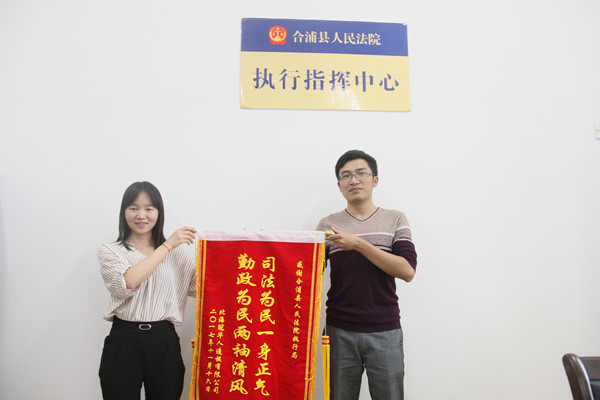 “张法官,我公司委托我来把锦旗送给你们,谢谢合浦法院执行局执行法官们尽心尽力地帮助我公司这么快拿到了欠款!”近日,申请执行人北海某人造板有限公司代表将两面印有“司法为民一身正气 勤政为民两袖清风”、“执法如山 为民解忧”的锦旗分别赠送给合浦法院执行局和执行中队,并对合浦法院执行工作和执行法官表示感谢。