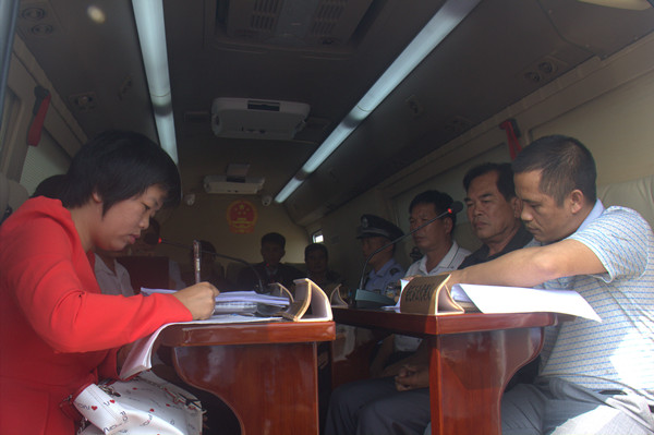 随即,书记员用巡回审判车上的便携式打印机将调解笔录及调解书打印出来,双方签字确认,法律文书经过电子签章之后直接送达给双方当事人。