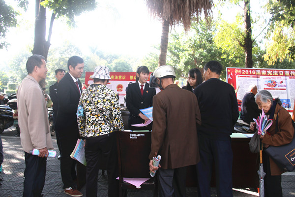 12月4日是我国第三个宪法日,为提高广大人民群众的法律意识,做好普法宣传,12月5日,28365365体育在线备用在合浦县人流密集点还珠广场组织开展了主题为“弘扬法治精神建设法治合浦”宪法宣传日活动,通过现场悬挂横幅,摆放展板,设置咨询台,发放宣传单,与群众面对面,进行法律知识宣传和解答。同时借助此次宣传活动向广大群众发放群众安全感满意度宣传资料,并耐心向群众解答,努力提升群众安全感和满意度。
